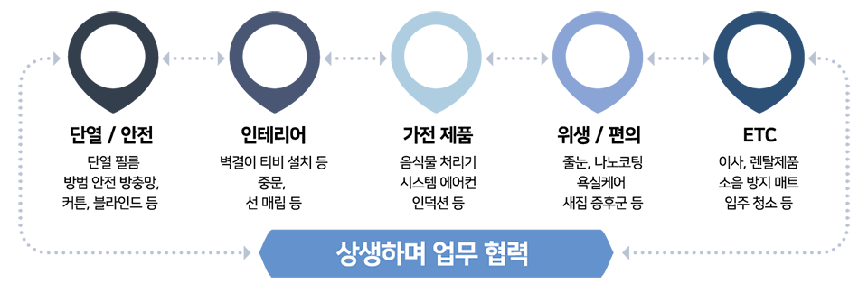 그러한 고민을 덜어드리며, 가격경쟁력을 제공해 드리기 위해 22개 업종 100여개의 전국 업체와 협력하여 공동 구매 주관 및 입주 박람회를 대행 진행합니다. 이러한 행사 진행으로, 협력 업체에게는 업체 홍보의 장을 열어드리며 입주민들에게는 발품을 팔지 않고 한 장소에서 해결 할 수 있는 편의를 제공해 드립니다.